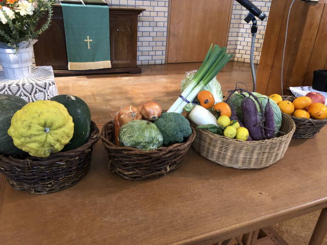 礼拝後は、サツマイモ、サトイモ、大根、人参、ごぼうなど具だくさんの豚汁とおにぎりを頬張り、お腹もいっぱいになりました。クイズも楽しみ、豪華な景品は、教会学校のサツマイモという、まさに収穫尽くしの日となりました。